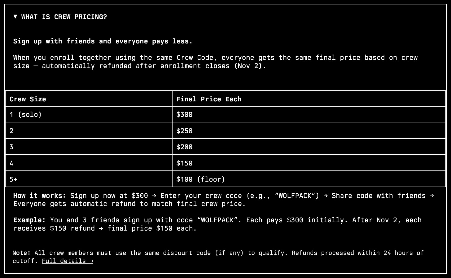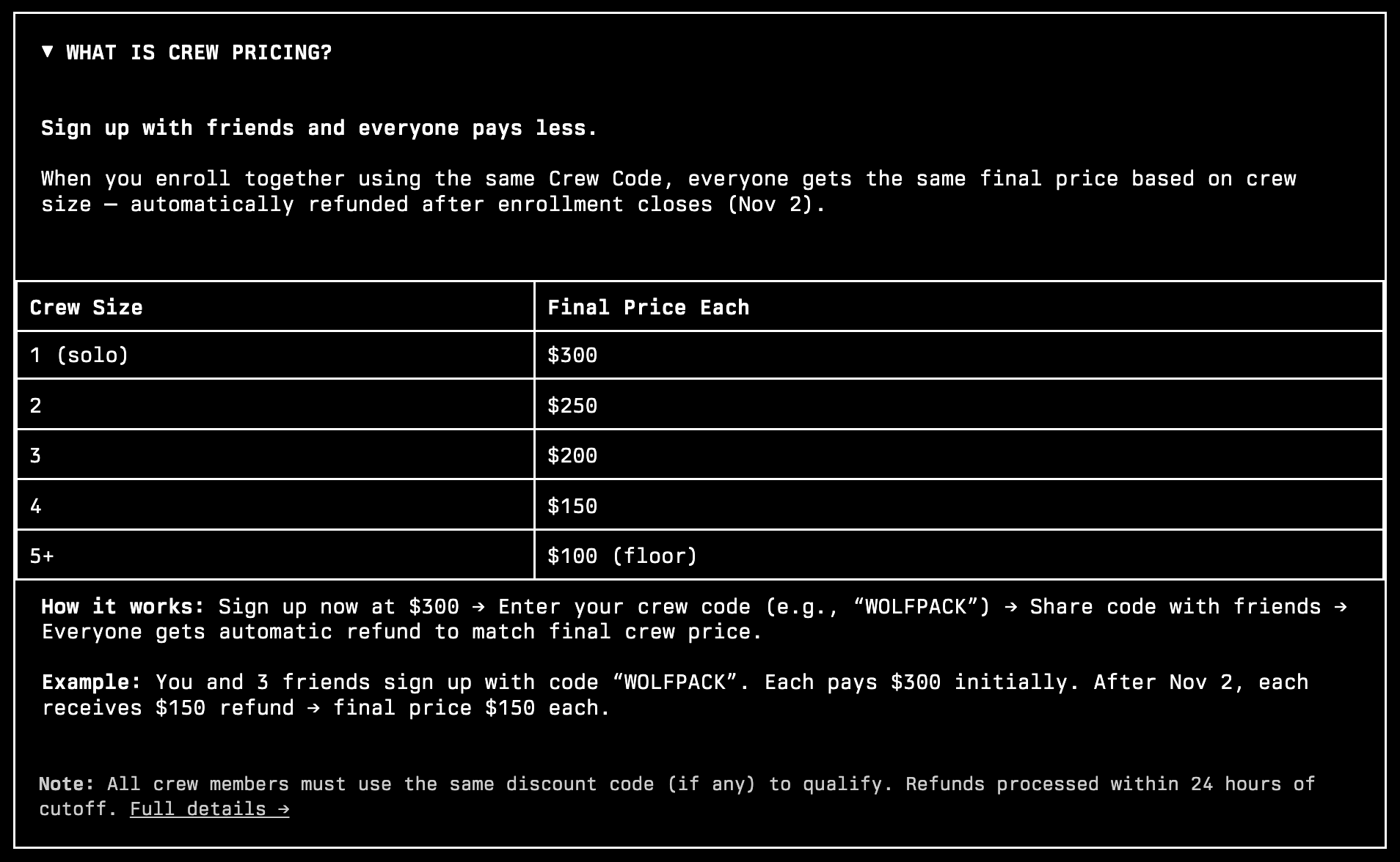 Here’s what I’d love to see: Tortuga members forming a crew unit within this cohort. Bring whatever you’re actually working on and use the program to pressure-test your approach and build missing capabilities. It would be incredible to see a Tortuga crew demonstrate its strength and have other people join as a consequence.